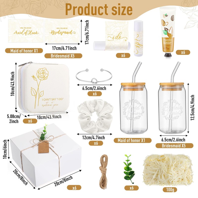 - Bridesmaid Proposal Gift Set: with this set, you get everything you need to surprise and delight your bridesmaids; It includes 6 personalized jewelry boxes, labeled for 5 Bridesmaid and 1 Maid of Honor, 6 glass cups, 6 lemon flavored lip balms, 6 hair ties, 6 elegant knot bracelets, 6 hand cream, 6 invitation cards and 6 gift boxes; It's a complete package filled with love and care