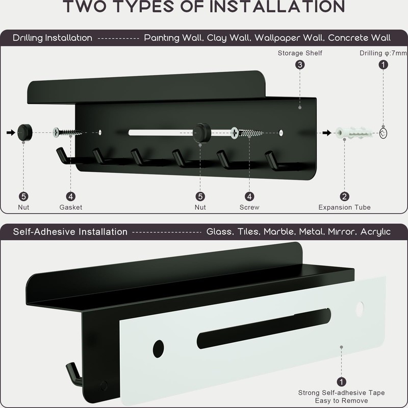 - [Two Installation Methods] Key hanger comes with screws and anchors, self-adhesive strips. For smooth surfaces such as glass, tiles, and wooden surfaces, self-adhesive is recommended. For surfaces such as wallpaper and painted walls, it is recommended to use drilled holes.