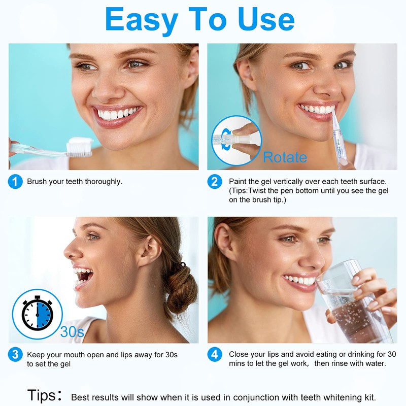 - Easy To Use: Twist the teeth whitening pen bottom clockwise to extrude the gel and paint it evenly on your teeth. Make sure you get it in all the cracks between your teeth without spilling onto your gums and lips. Rinse your mouth with water after 30mins of waiting without drinking or eating.