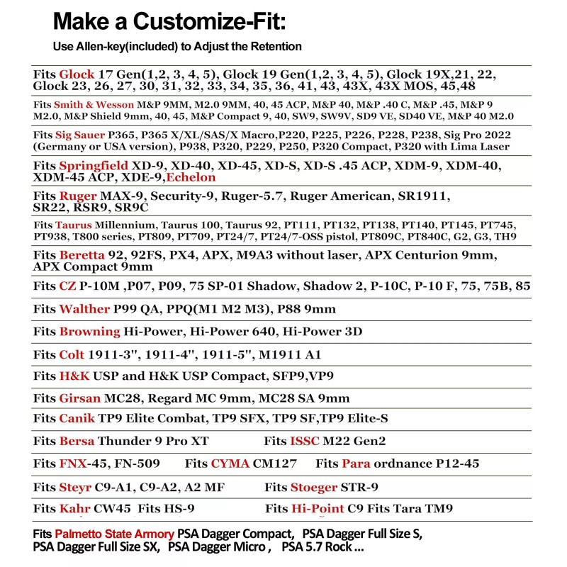 - Mega-Fit Holster Design: Perfectly compatible with different brands and more than 100 models, fitting a wide range of popular calibers including 9mm, 10mm, .40 cal, .45 cal, and .22 LR, offering a versatile solution for shooters with multiple firearms.To learn more about the compatible handgun models, please refer to the list at the end of the description.
