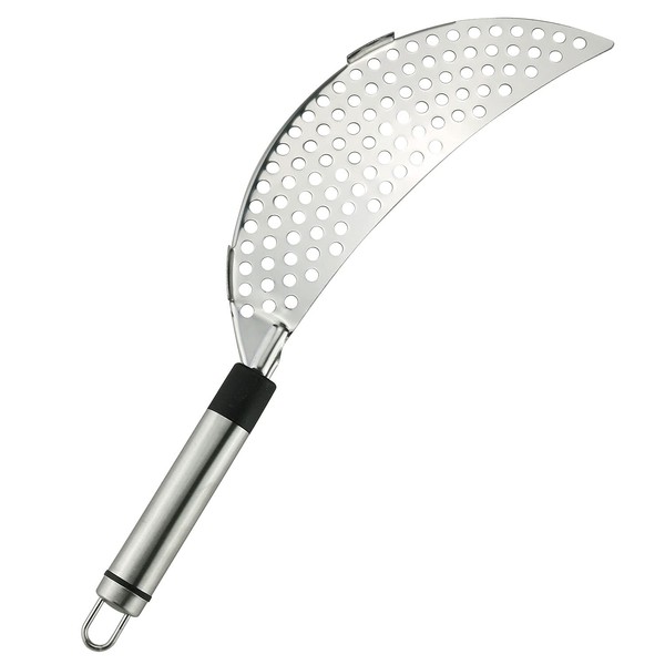- Stainless steel crescent pot strainer, spaghetti macaroni drainer, hand-held kitchen utensil, just put the crescent pot strainer on the pot, hold it by the edge, and pour out the hot water. No longer need to use a colander or other filters to clean or disturb.