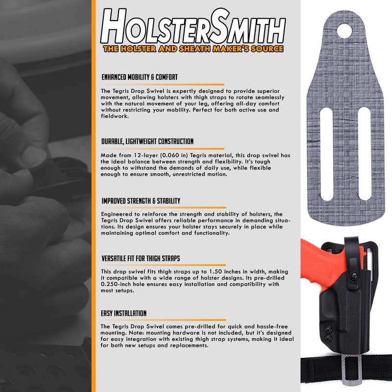 - Improved Strength & Stability: Engineered to reinforce the strength and stability of holsters, the Tegris Drop Swivel offers reliable performance in demanding situations. Its design ensures your holster stays securely in place while maintaining optimal comfort and functionality.