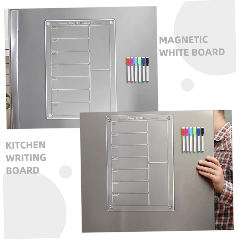 clear calendar Just attach it on your fridge and use it as a planning board to jot down every important thing for you and your family! By using it, you can easily share schedules, to-do lists and reminders with your family!.acrylic meal planner for fridge This magnetic white board is made of acrylic material and is built to last