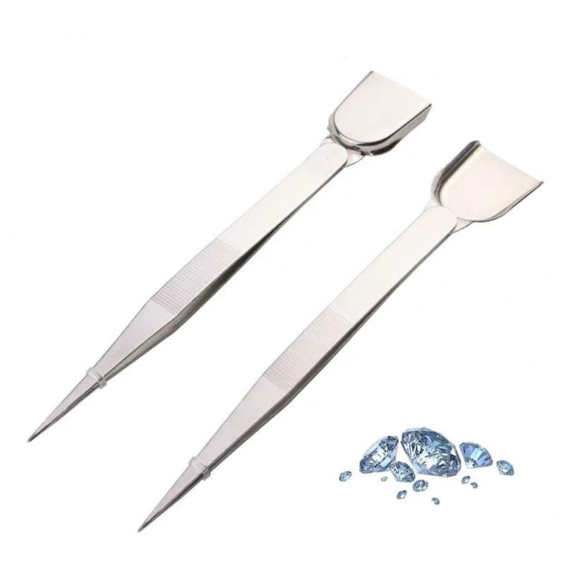 - Pointed end tweezers for work with attached shovel for lifting and moving various items to your workspace serving tray.