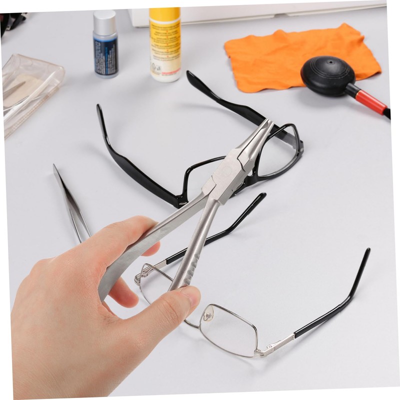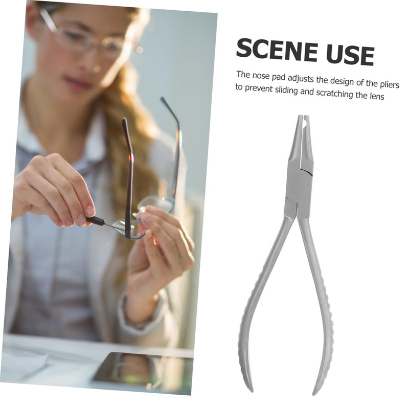 pliers for rimless glasses repair The sharp mouth of the plier makes it easy to hold tiny nose pads or other small objects.eyeglass adjust pliers With its wavy designed handle, it is anti-slip and comfortable to hold.nose pad adjust pliers Des cription The eyeglass repair plier is a versatile tool that can be used for a variety of tasks