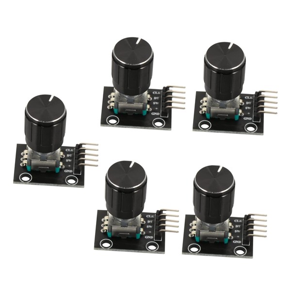 Enhance your projects with this set of 5 rotary encoder modules featuring a potentiometer rotary knob.These modules are ideal for industrial controls, robotics, photographic lenses, and computer input devices.Designed for stepper and servo motor control, they can also be used to manage devices like digital potentiometers.The 360-degree rotary encoder code is suitable for applications such as dvd players, household equipment, automotive accessories like car amplifiers, and volume control for personal and professional audio equipment.With the integrated key on the rotary encoder, you can conveniently reset the module to its initial state, starting the count from zero.These modules convert the angular position or motion of a shaft or axle into digital output signals, making them for machine applications.Compact in size at approximately 1.18 x 1.18 x 0.79 inches and lightweight at 2.01 ounces, these modules are easy to integrate into various setups.The black color and power module construction ensure reliability and seamless performance in diverse environments.