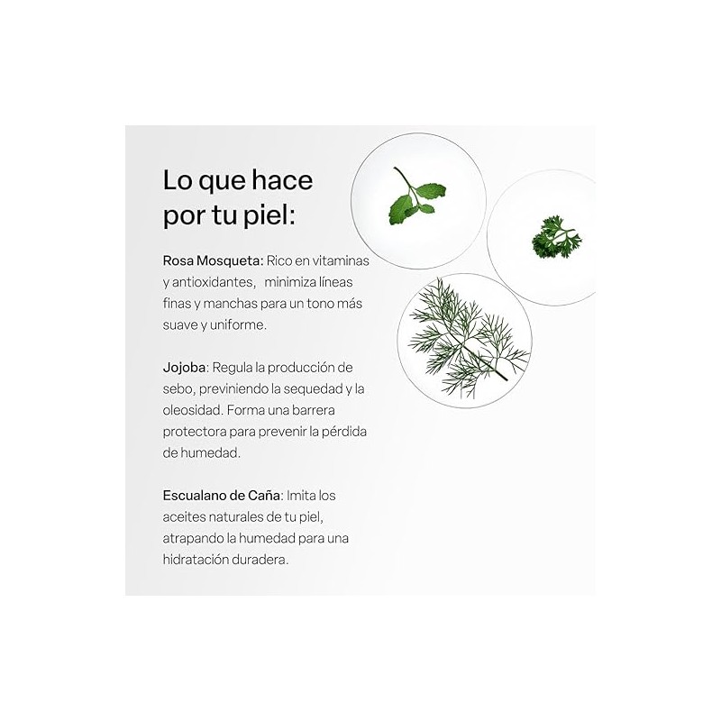 - *Escualeno Vegetal: Un hidratante excepcional que emula la hidratación natural de tu piel, envolviéndola en un manto de suavidad que la preserva jugosa y joven.