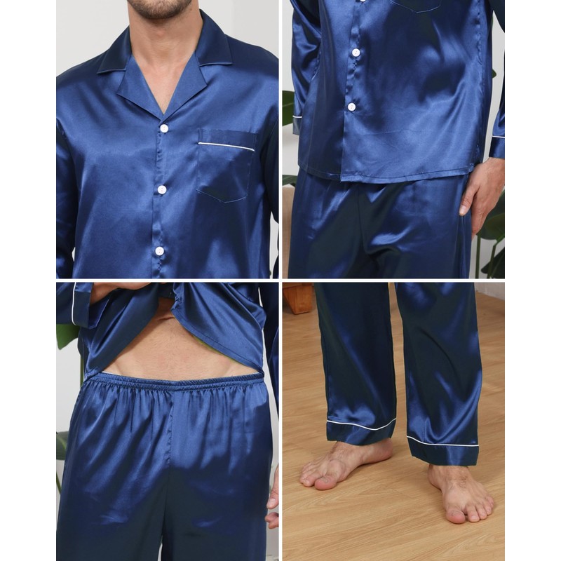 - FAUX SILK MATERIAL: The men's pajama set is made of high-quality faux silk, made of 95% polyester + 5% spandex. Which is soft, lightweight, comfortable breathable, and skin friendly, allowing you to have a comfortable sleep