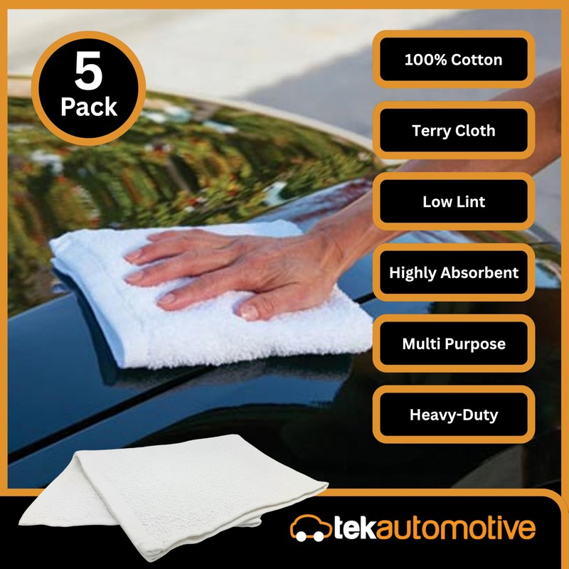 Tek Automotive Heavy Duty Terry Towelling Cleaning Cloths – 5 Pack – 100% Cotton, Low Lint, Highly Absorbent, Ideal for Polishing, Valeting, Glass & Interior – 43cm x 37cm Machine Washable
