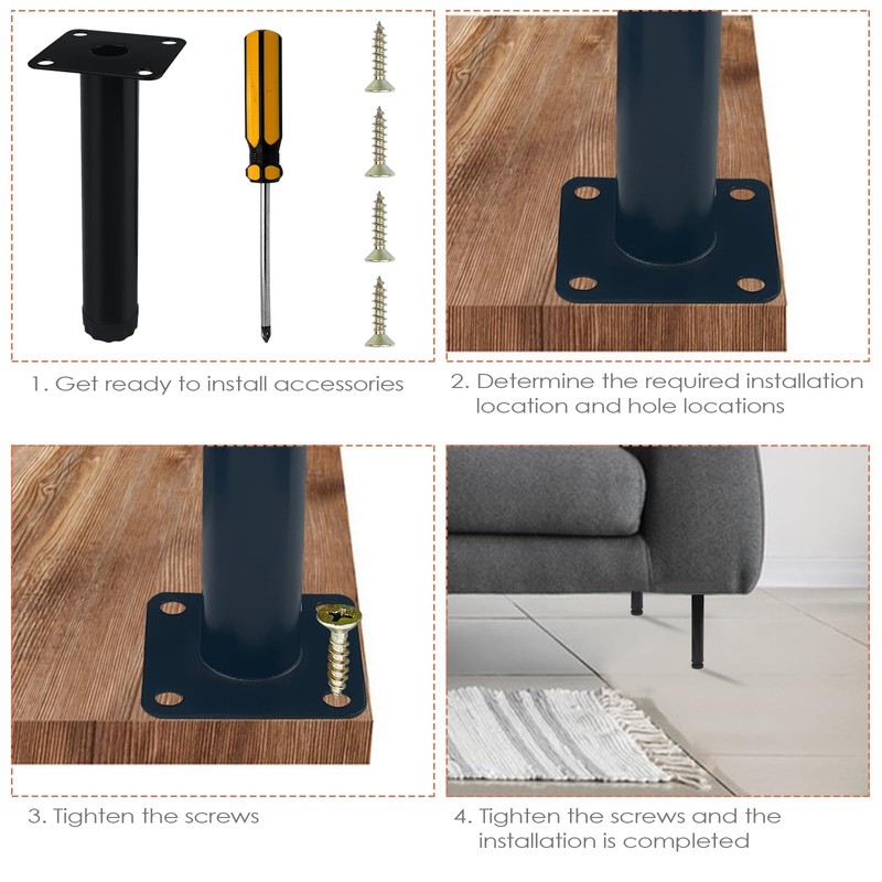 - Easy to install: you will receive 1 bag of furniture legs with 4 parts inside. These adjustable table legs are equipped with 4 pre-drilled holes for quick and easy installation. Simply adjust the desired height, mark the mounting position and holes required for installation, screw in and the assembly is done.