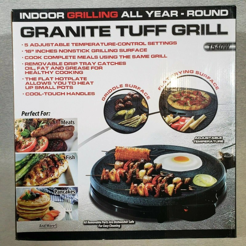 Granite Tuff Indoor Grill 16" Round Electric w Nonstick Surface Dishwasher Safe 5 Adjustable temperature control settings 16" (40.6 cm) nonstick grilling surface Cook complete meal using the same grill Removable drip tray catches oil, fat and grease for healthy cooking The flat hotplate allows the heating of small pots Cool-touch handles 1540 watt power rating All removable parts are dishwasher safe for easy cleaning Shipping weight is 8 pounds Ships in manufacturer's packaging (not reboxed) |
