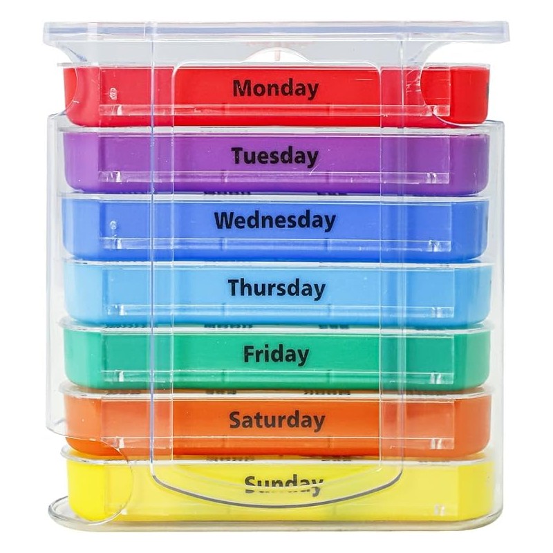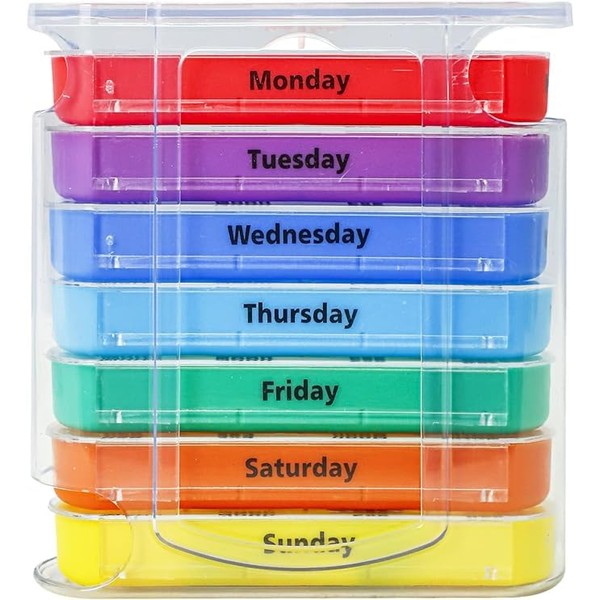 - VIVID COLORS: The outer case is designed transparent and each tray has unique bright color for the user to easily distinguish days of the week.