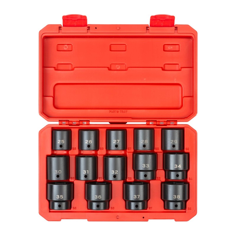 - Includes 14-pc. 1/2 inch drive 6-point impact sockets: 25, 26, 27, 28, 29, 30, 31, 32, 33, 34, 35, 36, 37, 38 mm; Storage case