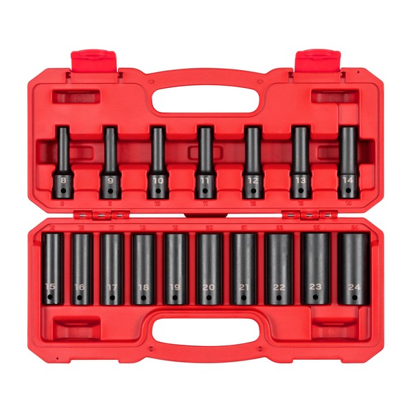 • Includes 17-pc. 1/2 inch drive deep 12-point impact sockets: 8, 9, 10, 11, 12, 13, 14, 15, 16, 17, 18, 19, 20, 21, 22, 23, 24 mm; Storage Case