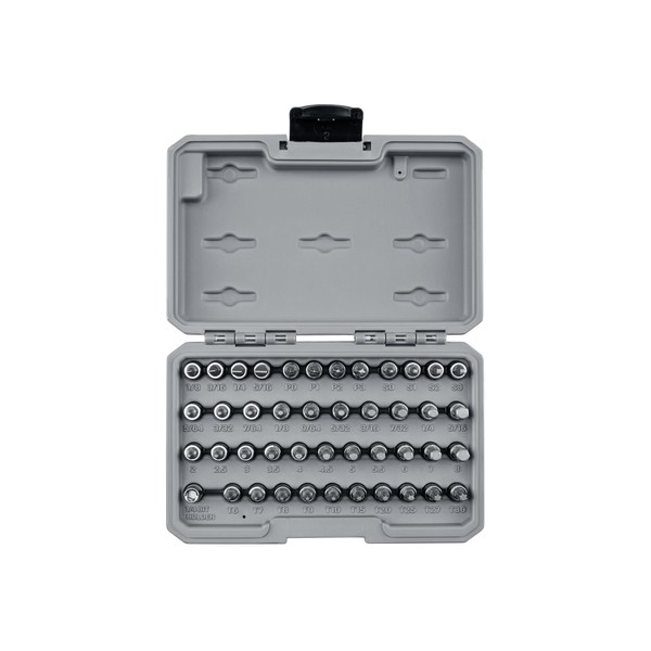 - Includes 10-pc. 1/4 in. drive inch hex bit sockets: 5/64, 3/32, 7/64, 1/8, 9/64, 5/32, 3/16, 7/32, 1/4, 5/16 in.; 11-pc. 1/4 in. drive metric hex bit sockets: 2, 2.5, 3, 3.5, 4, 4.5, 5, 5.5, 6, 7, 8 mm; 10-pc 1/4 in. drive torx bit sockets: T6, T7, T8, T9, T10, T15, T20, T25, T27, T30; 4-pc. 1/4 in. drive Phillips bit sockets: #0, #1, #2, #3; 4-pc. 1/4 in. drive slotted bit sockets: 1/8, 3/16, 1/4, 5/16 in.; 4-pc. 1/4 in. drive square bit sockets: S0, S1, S2, S3; Magnetic hex bit holder socket; Carrying case