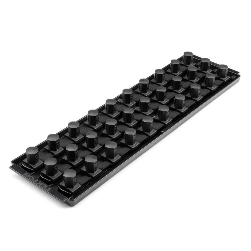 This Tekton Socket Organizer Set is a universal socket organizer that securely holds 1/4 inch drive sockets and bit sockets. Rail capacity may vary based on individual socket diameters. Place sockets onto the clips to store them loosely, or twist them clockwise onto the clips to lock them in place. Detent bumps on the clip tabs engage with the socket to keep it secure, even when on the go. Sockets with only two detent grooves, such as impact sockets, will not engage with detent bumps on the tabs if placed incorrectly. Lock the rails into the tray with the keyhole slot. To release, press the button beside the keyhole latch and slide the rail out. The tray securely holds socket rails in an upright position, even through the opening and closing of tool chest drawers. Handles on either side of the tray make it easy to lift out of a drawer. Our rails and trays are molded from strong ABS polymer, providing stiffness and robust support for sockets. The clips are made from durable nylon polymer, designed to withstand frequent socket removal and chemical exposure. For large or heavy socket sets, we recommend fully supporting the rails and trays to prevent bowing. Twist-to-Lock – Place sockets onto the clips to store them loosely, or twist them clockwise onto the clips to lock them in place Lock Into Tray – Lock the rail into a tray with the keyhole slot and release it by pressing the button beside the keyhole latch and sliding the rail out Rigid ABS and Nylon Construction – Our rails and trays are molded from strong ABS polymer, and the clips are made from durable nylon polymer