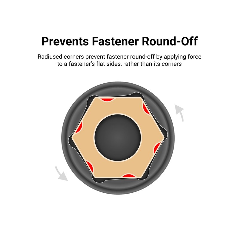 • Prevents Fastener Round-Off – Radiused corners prevent fastener round-off by applying force to a fastener's flat sides, rather than its corners