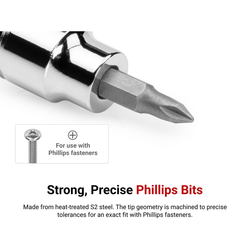 - Bit tips are machined to precise tolerances for strong engagement with fastener heads