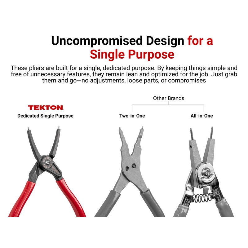 - Includes 9 inch internal retaining ring pliers (0.090 in. tips); 9 inch 90-degree internal retaining ring pliers (0.090 in. tips); 9 inch external retaining ring pliers (0.090 in. tips); 9 inch 90-degree external retaining ring pliers (0.090 in. tips)
