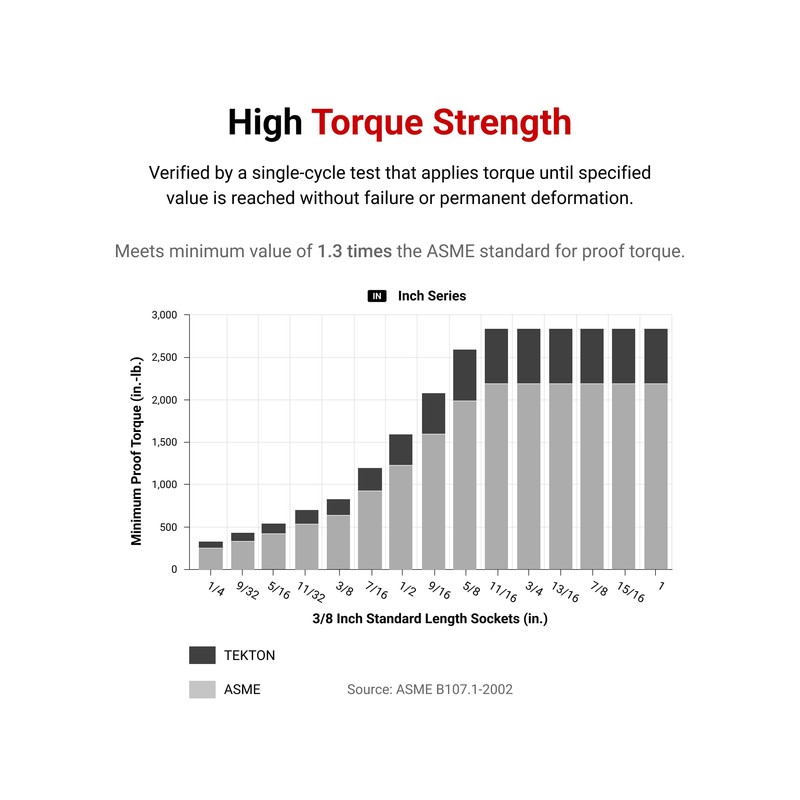 Tekton 3/8 inch drive 12-point sockets are an exact fit for double hex fasteners and also work with hex and square shapes. They're designed to grip the sides and not the corners of the fastener heads, which prevents round-off. The large, die-stamped markings are permanently impressed into the material and optimized for readability.