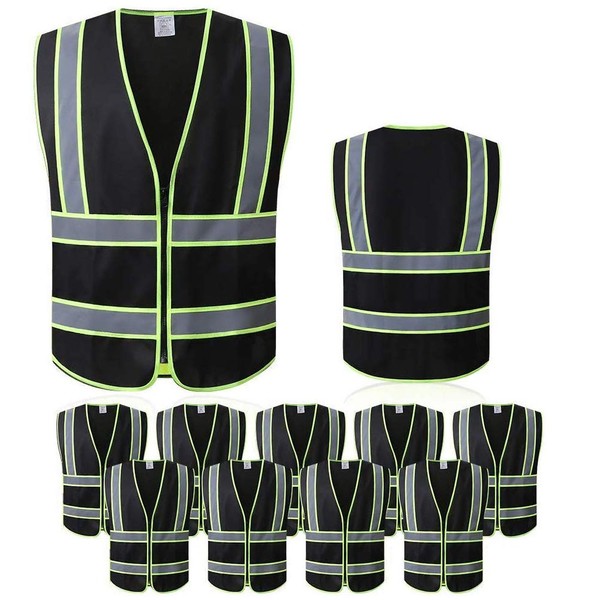 Tekware Safety Vest with High Reflective Strips, Pack of 10 Bright Neon Color Construction Protector with Zipper (XX-Large, Black-10PC)