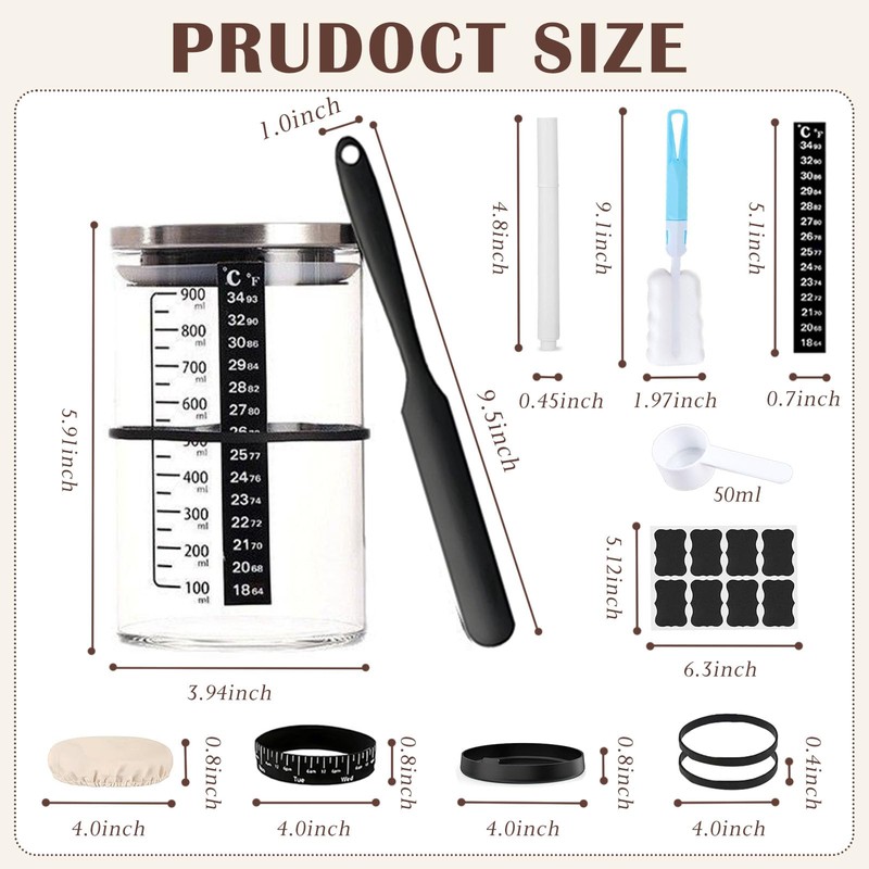 - Versatile fermentation container: the 1000 ml fermentation container made of high-quality glass has a wide bottle neck for easy adding and cleaning. With silicone spatula, temperature paper and thermometer, it is perfect for sourdough starter set, fermentation pot or kimchi container.