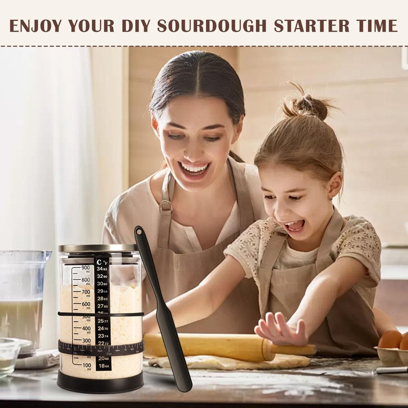 - Practical - The wide opening of the starter jar makes it easy to fill and remove ingredients. The silicone spatula allows residue-free, even and efficient mixing of the dough. Feeding tape ensures precise tracking of feeding times - ideal for bread baking accessories and bread moulds.