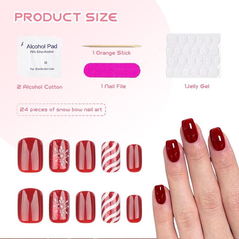 2.EXTENSIVE SET: This set contains everything you need for your manicure: 24 Christmas nails, 24 double-sided adhesive stickers, a file, a wooden stick and a cleaning pad. You don't need to buy anything extra as this kit is fully equipped to give you a professional nail salon treatment at home