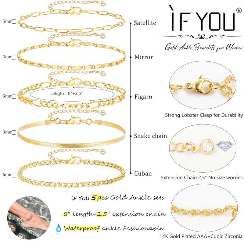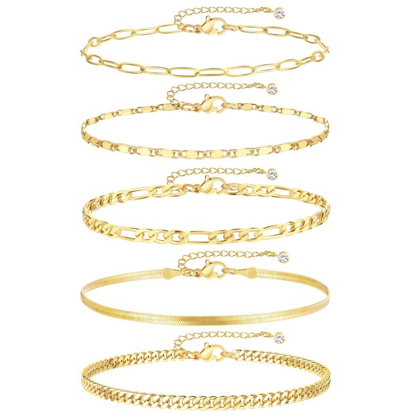 TELAIN Pack of 5 Gold Foot Bracelets for Women, 14k Gold Platinum Plating, Waterproof, Cuban Chains, Ankle Set, Layered Foot Bracelets for Beach Gifts, Adjustable Size, gold, L