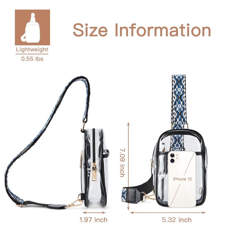 - Multi Ways to Carry - This clear bag for women comes with a adjustable shoulder strap. The leagth of strap is 31 to 53 inches. You can tighten or loosen the strap to fit your size or activity needs. It could be a clear crossbody purse, sling bag, fanny pack, chest bag, or even a shoulder bag.