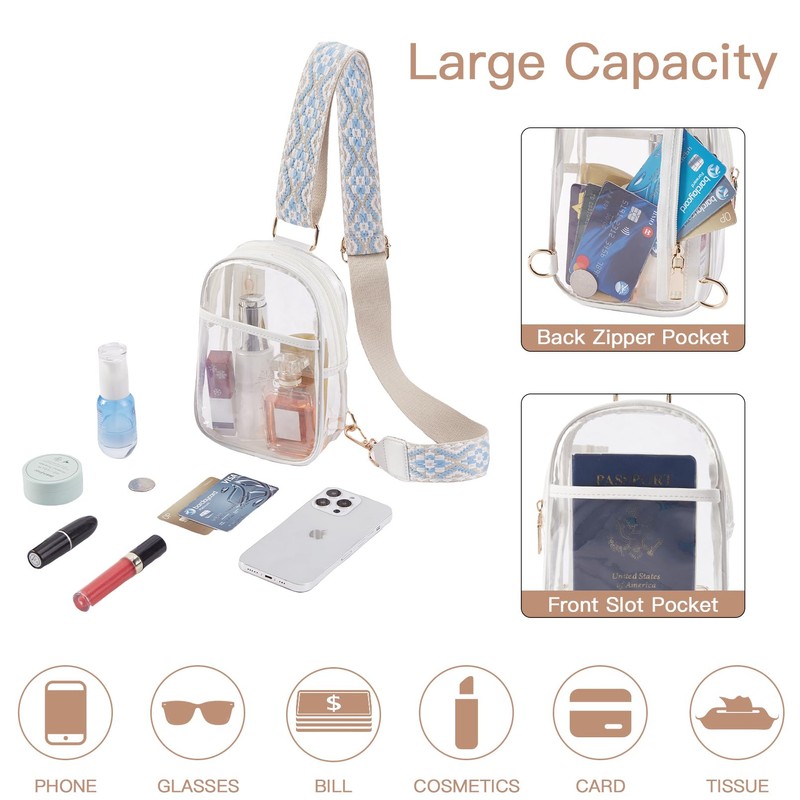 - Clear Bag Stadium Approved: Telena clear sling bag is made of soft and non-toxic transparent TPU which can get through security easily. It's an great clear fanny pack whenver your're concerts; stadium; airport security check; workplace; daily life or other outdoor activities