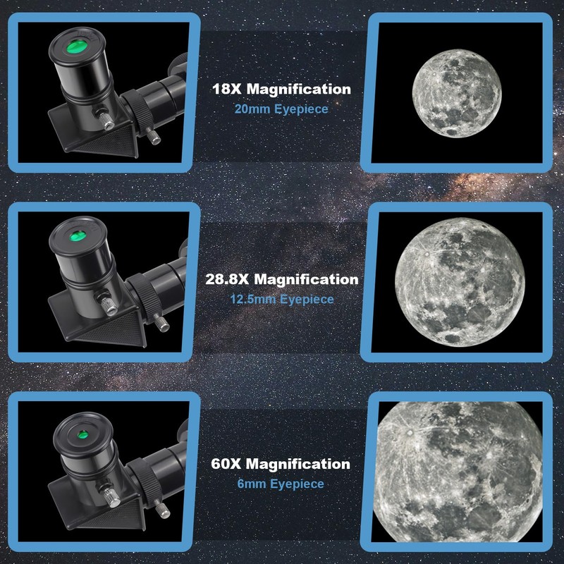 - ✨【Multiple Eyepieces】Our durable telescope for Kids Beginners and Adults is quipped with three excellent-quality eyepieces. Includes H20mm, H12.5mm, and H6mm eyepieces for different magnification levels.