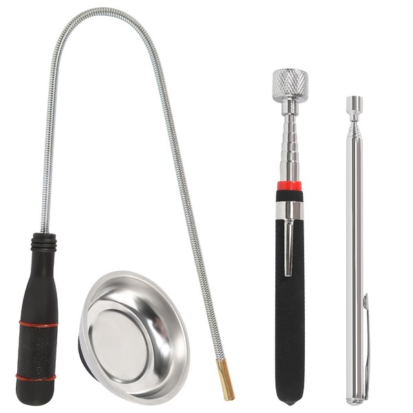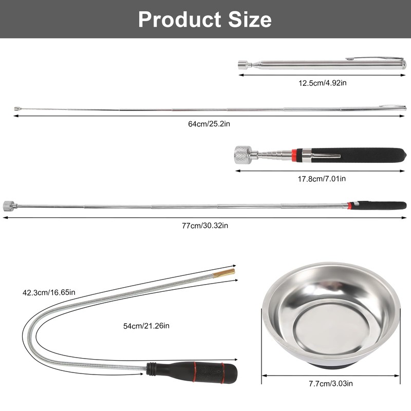 • 【Magnetic Tool Set】 Includes 1pc 15 LB (from 7 inches to 30.5 inches) telescopic magnetic pickup tool, 1pc 1.5 LB (from 5 inches to 25.4 inches) retractable magnetic pickup tool, 1pc 55cm flexible magnetic pickup sweeper with bendable telescopic pole, 7.5 x 7.5 cm round magnetic parts tray.