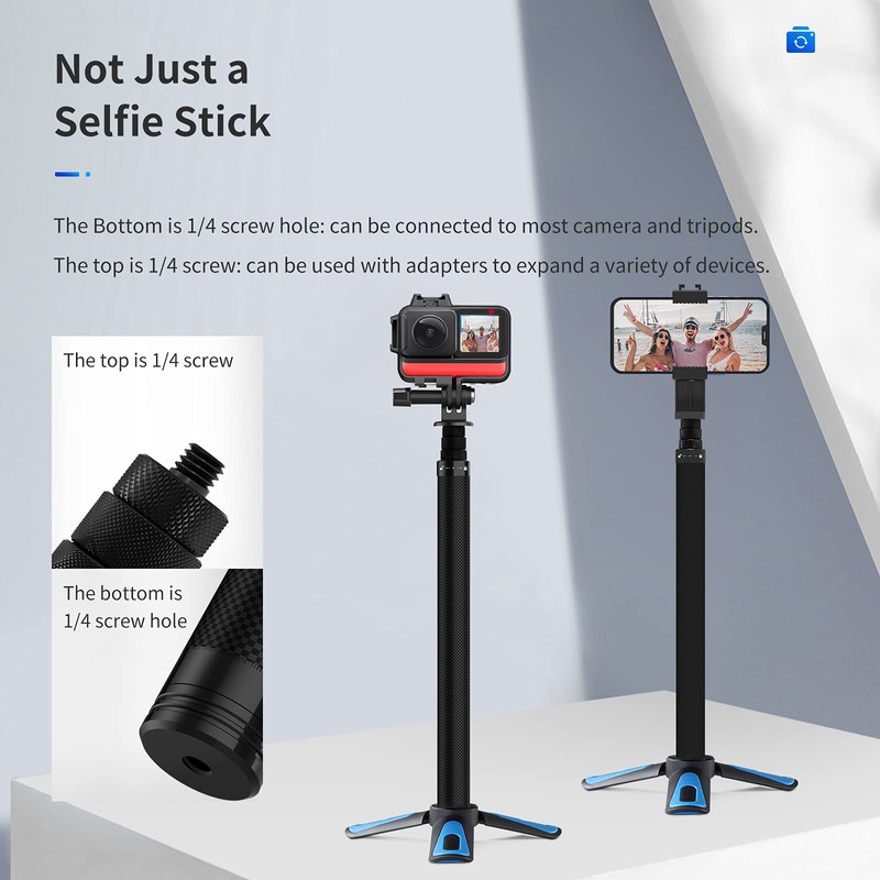 - ★【Waterproof & Comfortable Material】The selfie pole made of carbon fiber material which combines strength and toughness, makes it waterproof and rustproof, allows it to use in rain, snow and surfing.