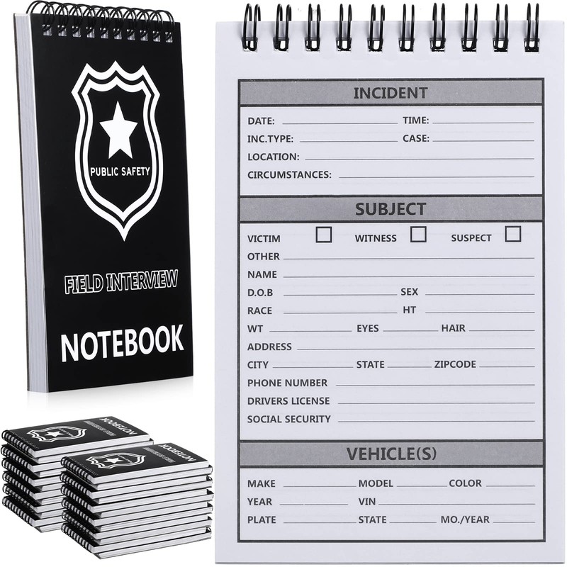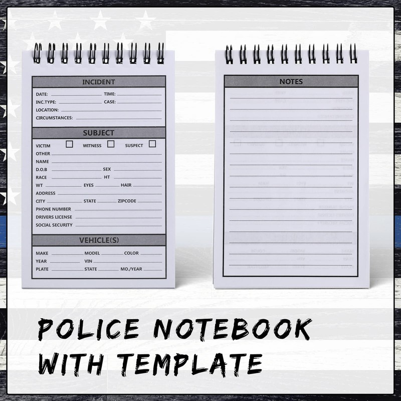 - Public Safety Police Notebook: our police field interview notebook could make taking notes in the field more easy, which are made of 0.06 inches/ 1.5 mm thick backing plate, supply the extra stability for a sturdy writing surface; Also these police notebooks with template, make notes more concise and clear