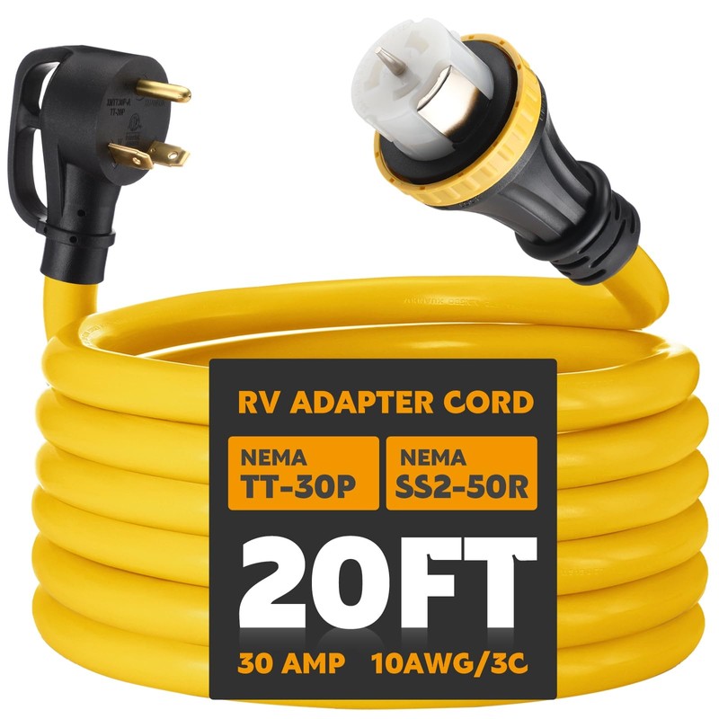 - High Visibility Safety Design: The yellow bright jacket makes this TT-30P to SS2-50R RV adapter cord easy to spot even in dim light or crowded campsites. Its visibility reduces tripping hazards, ensures safer operation, and provides quick identification