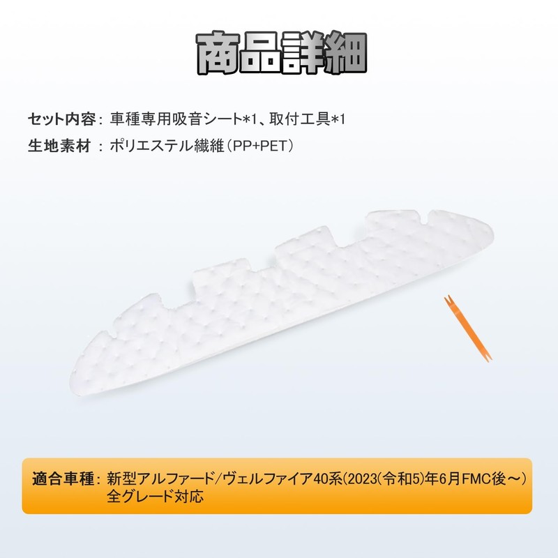 - Compatible models: Alphard Vellfire 40 series, compatible with all grades, R5.6 - Current. Note: There may be cases where it may not fit depending on the year, grade, and options, so please check the product shape and the car before purchasing. Set Includes: 1 x sound-absorbing sheet for cars, 1 x mounting tool. Fabric Material: Polyester Fiber(PP+PET)