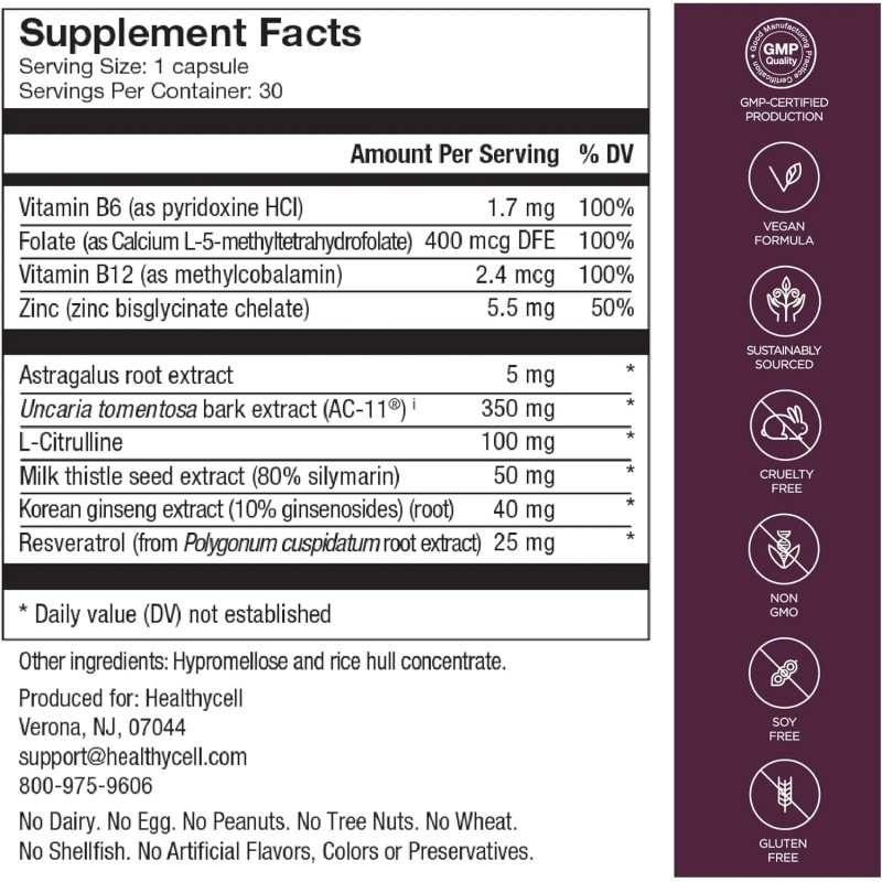 - POWERED BY HERBAL EXTRACTS, COENZYMATED VITAMINS & ANTI-OXIDANTS: Clinically proven rainforest extract, AC-11, works with Zinc to repair cellular DNA. Essential coenzyme vitamins 5-MTHF (the active form of folate) and Methylcobalamin (the active form of B12) reduce homocysteine. High potency herbal extracts boost telomerase enzyme production, and a resveratrol / L-citrulline combo enhances nitric oxide.