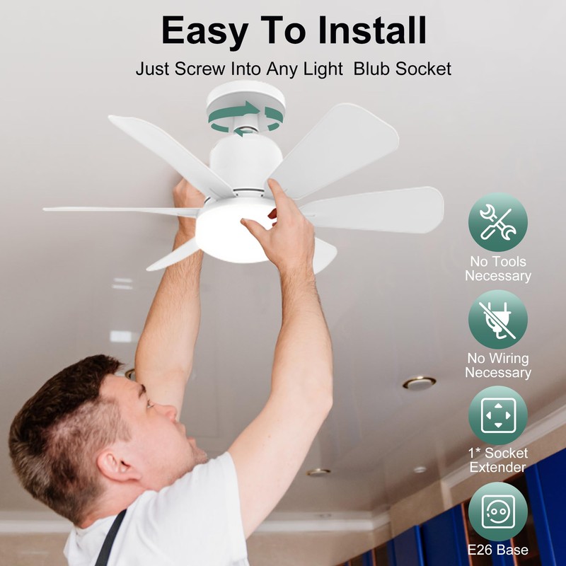 - 【Easy Installation & Socket Extender】Compared to traditional ceiling fans, the socket fan ceiling fan with light be installed easily as a regular light bulb, while still being completely cordless and clutter-free. The most special thing is that extension E26 base of 4 inches allows the fan with light to be installed anywhere.