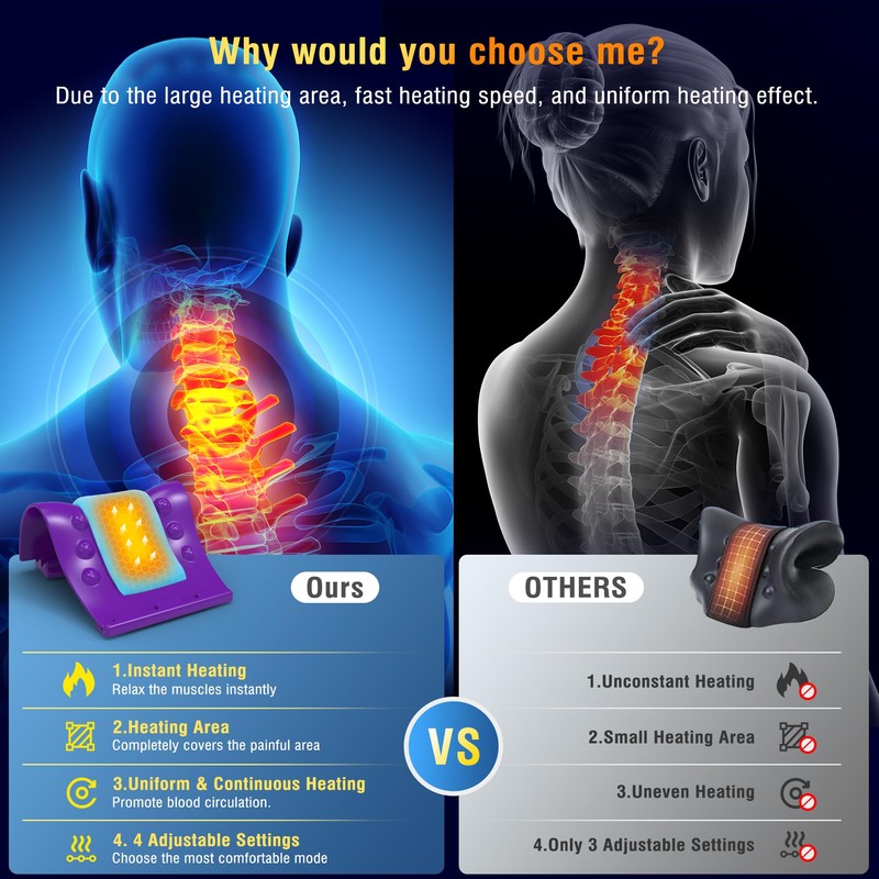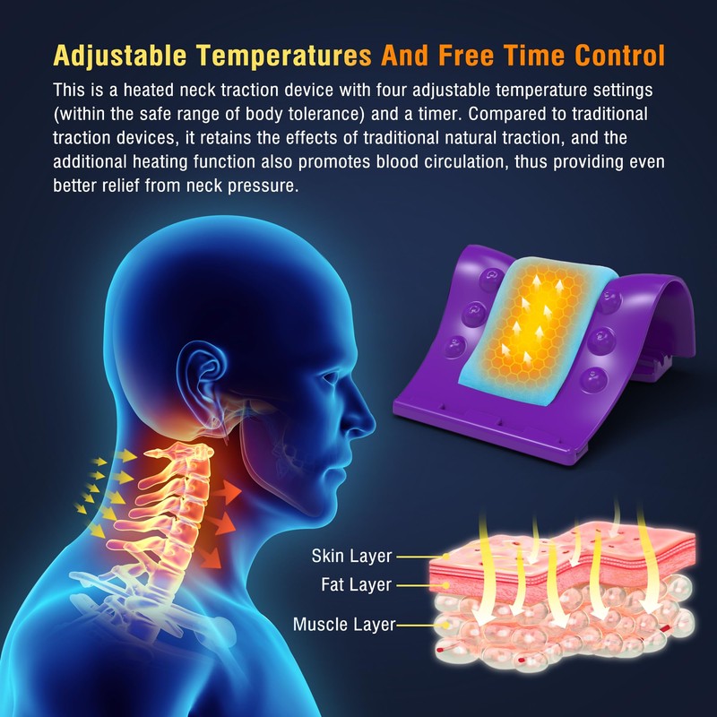 - 【COMPREHENSIVE IMPROVEMENT OF SHOULDER AND NECK TENSION】The neck stretcher is designed for neck discomfort caused by cervical spondylosis, tension headaches, nerve compression and muscle stiffness.Customized according to the cervical spine specialists to repair the neck heating function, through the appropriate temperature to promote blood circulation, oxygen supply and reduce pain while repairing the neck hump, let you feel the difference.
