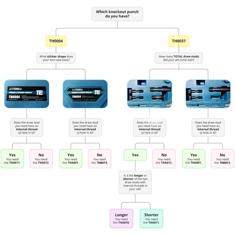 We're constantly improving our products, and our hydraulic knockout punches have gone through a few iterations over the years. As such, if you purchased a hydraulic knockout punch set from us a before a certain time, you're going to need a specific draw stud. Check out our quick selection help guide in the image gallery.