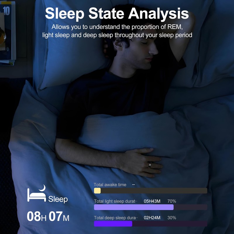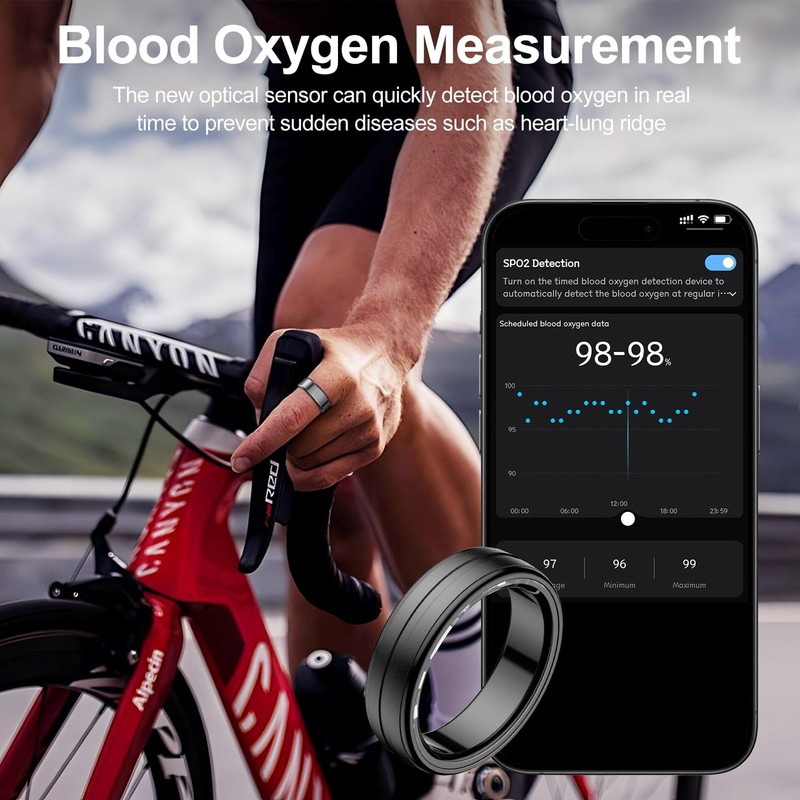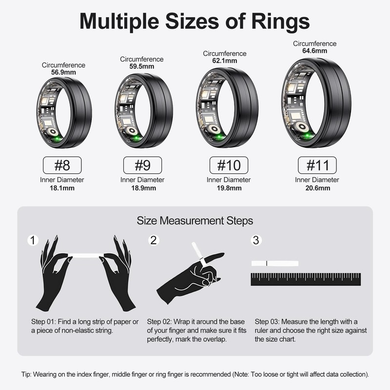 - 【Multiple Options & No Subscription Fees】The smart ring is available in 2 colors and 4 sizes for you to choose from 18.1mm (#8) 18.9mm(#9) 19.8mm(#10) 20.6mm(#11). It can easily track your sleep status, body data and more through the mobile app WITHOUT any subscription fees. (Please measure the circumference of your finger according to the diagram on the details page before purchasing)