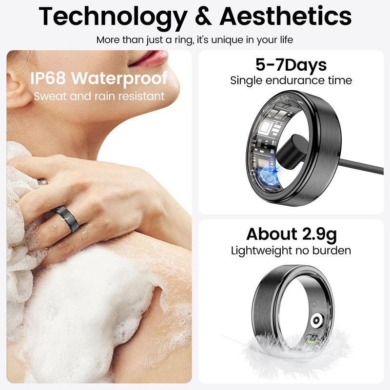 - 【No Sense of Wearing】Feeling restrictive about wearing a watch every day? You deserve a smart ring. Made of SUPER lightweight, skin-friendly, high-quality aluminium alloy, no burden but durable to improve your quality of life in a targeted manner (Note: At the beginning of use, the smart function gradually accumulates data to achieve a customized and accurate analysis of individual health). The new module takes only 2h to charge and lasts up to 5-7 days