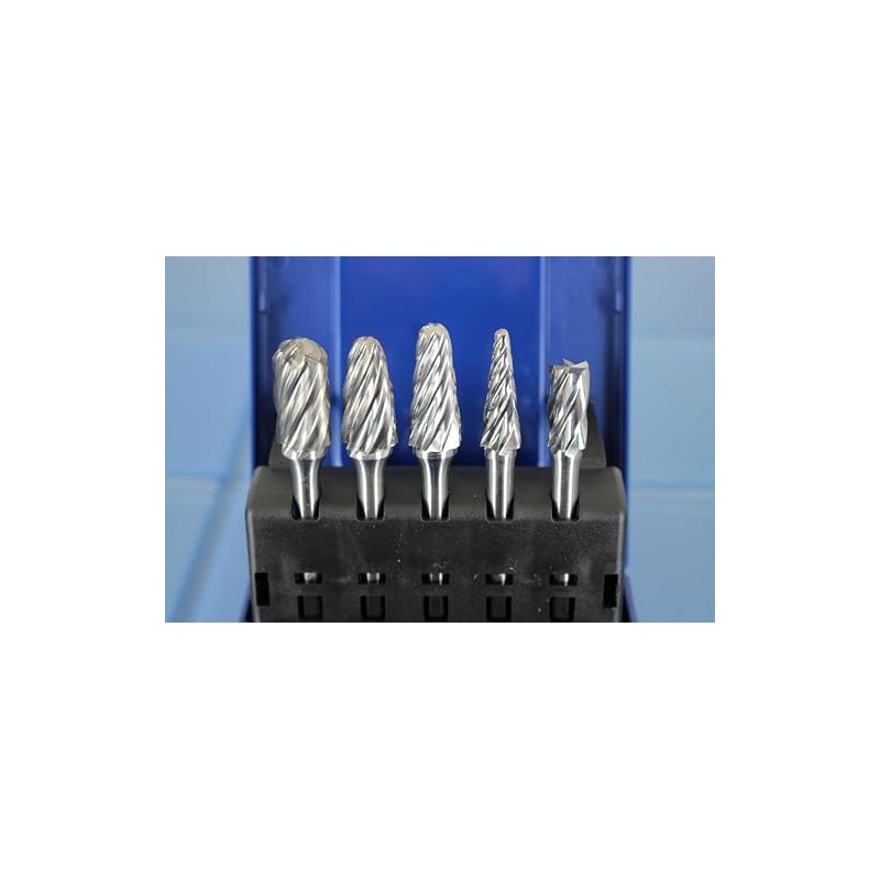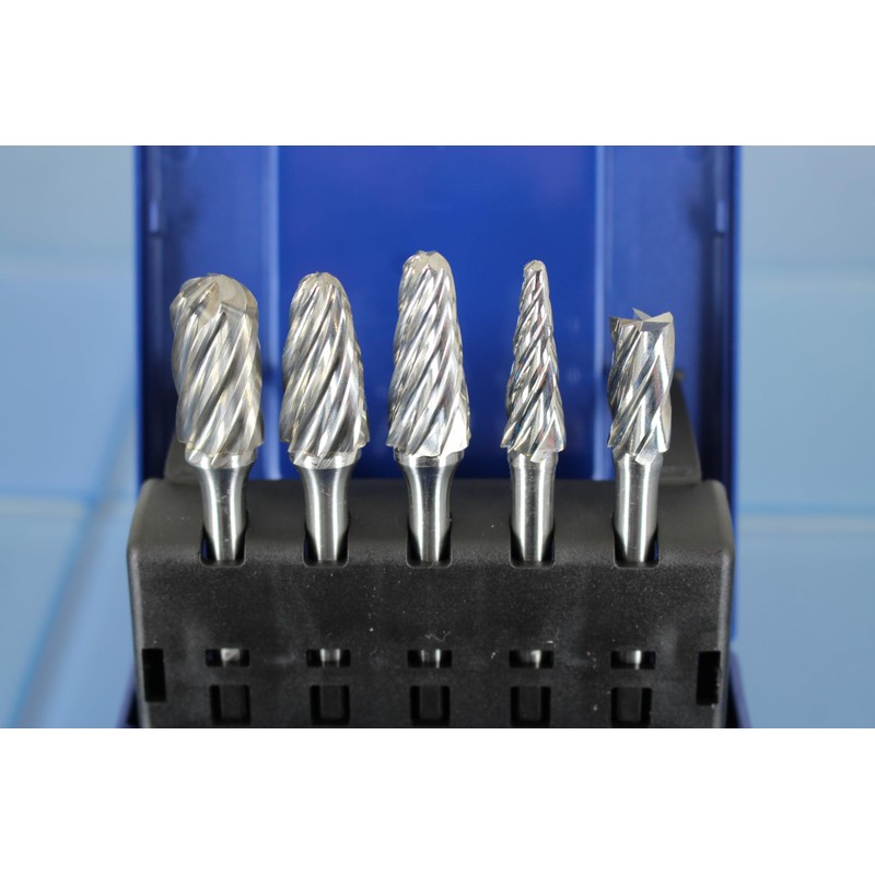 - 5 pc NF Aluminum Cut CARBIDE ROTARY BURR FILE Set, 1/2 inch and 3/8 inch HEAD, 1/4 inch diameter 2 inch Long Shank
