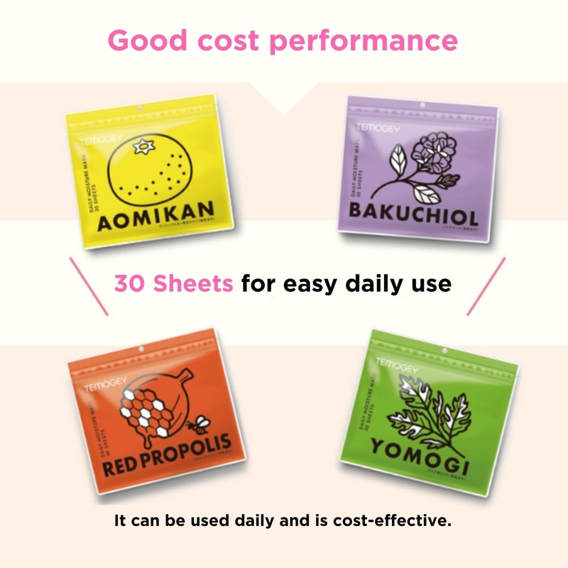 - Choosing a Face Mask Based on Your Skin Concerns: TEMOGEY Recommended Features of TEMOGEY: ・First Point: "Choose from 4 Varieties Based on Effectiveness" A cost-effective option with carefully selected ingredients. The packaging features a vibrant design, making it easy and fun to pick up.