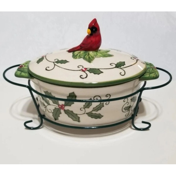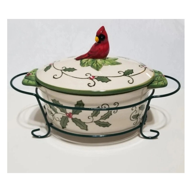 Temptations by Tara Cardinal 9oz Oval Casserole w/Lid & Wire Holder/Rack for Christmas & Holidays