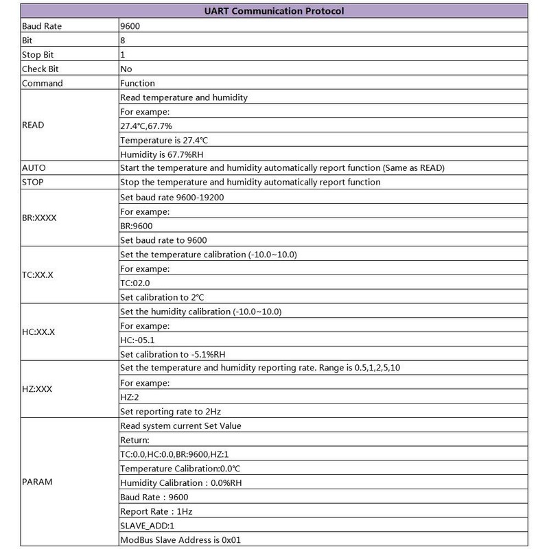 9>.This product integrating MODBUS protocol and ordinary UART communication protocol, users can choose communication protocols, UART communication support automatic report function (Connect the RS485 serial interface mode tool by automatically output temperature and humidity).