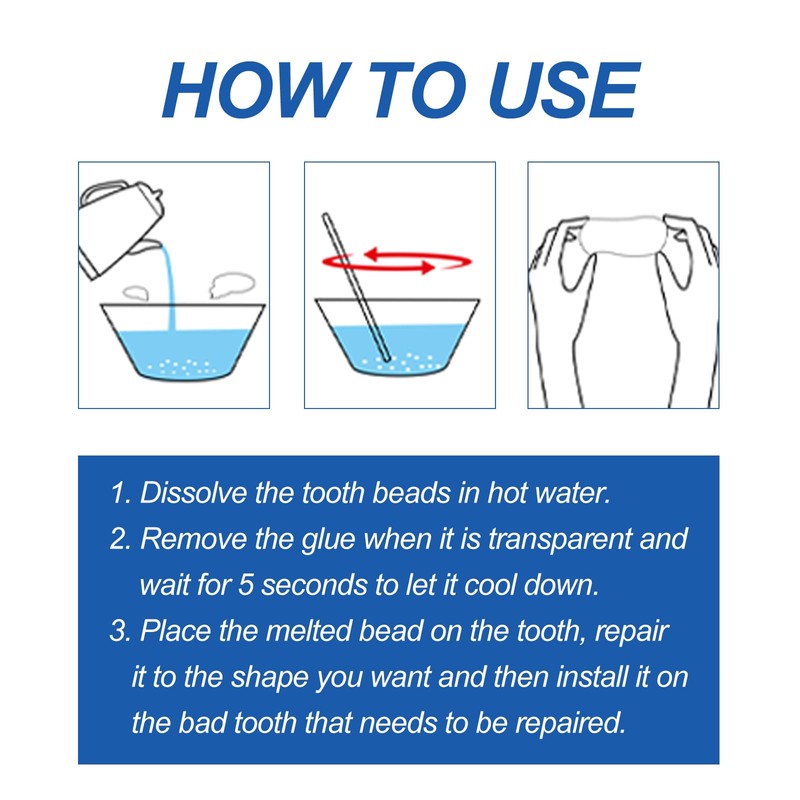 - Easy to Use:This denture restoration kit comes with an instruction manual,Simply soften the teeth beads in hot water, shape them to fit your tooth, and place them in position. They will quickly cool and harden for a seamless temporary repair.