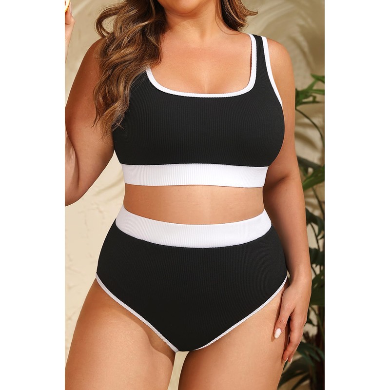 - Plus Size Black White Color Block Bikini Set: Elastic textured fabric, unique wide shoulder straps and high waist bikini bottom make you feel more comfortable and attractive.
