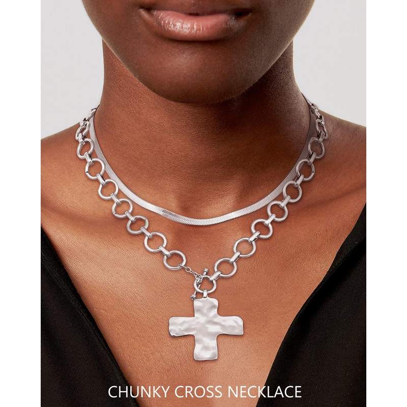 - Chunky Statement Choker Necklace Set: This layered cross pendant necklace stacks for women features two seperate necklaces including: 1 thick silver chain link necklace(16.93''Length*0.5‘’Width) , 1 bold hammered silver cross pendant(1.61''Height*1.61''W), 1*silver plated herringbone snake chain necklace(14.17'+1.96'' adjustable extender,0.15''width). Wearing this distinctive chunky silver cross necklace stacks, you'll shine like the brightest star in the crowd.